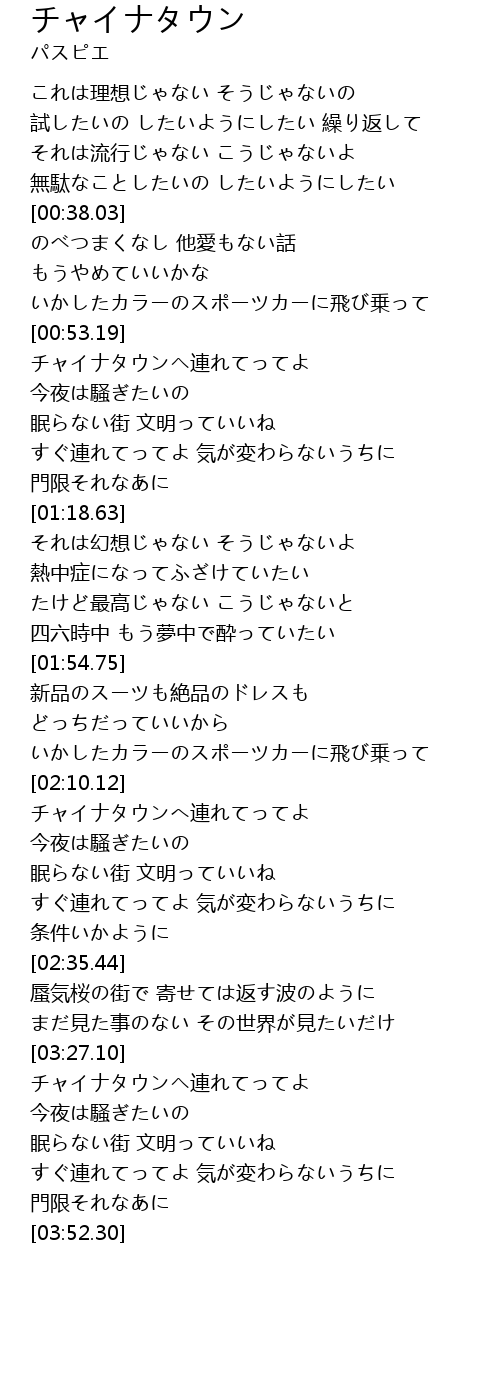 | [03:29.32] | チャイナタウンヘ連れてってよ |