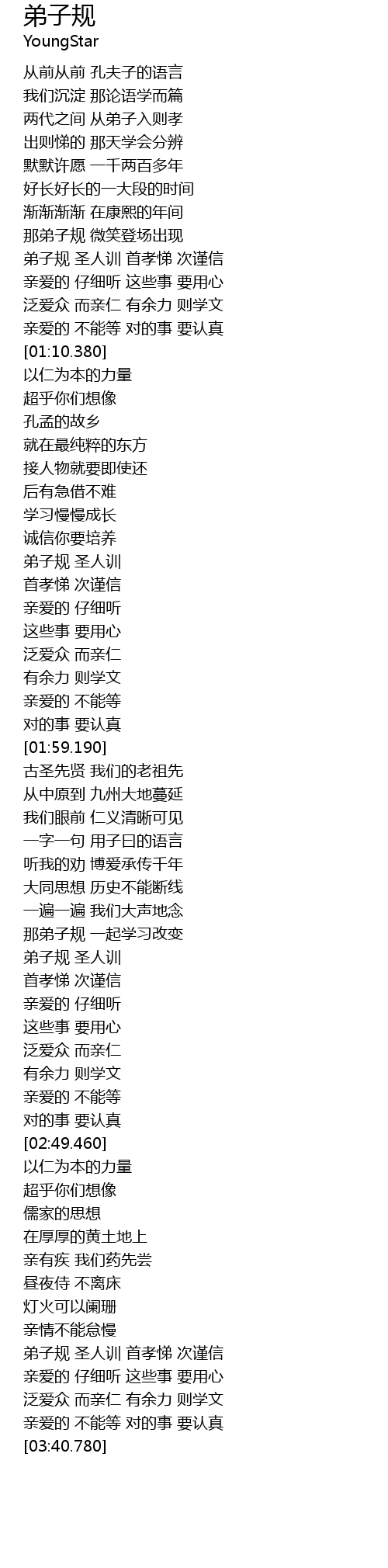 | [03:13.810] | 弟子规 圣人训 首孝悌 次谨信 |