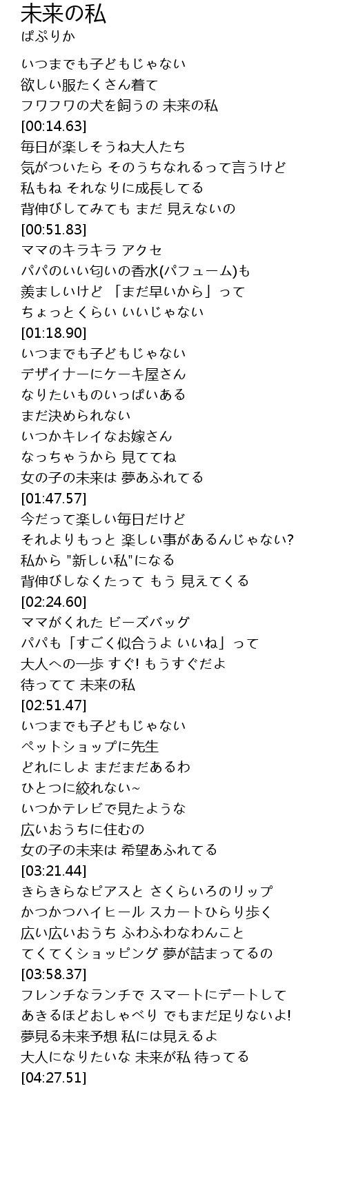 | [04:19.04] | 大人になりたいな 未来が私 待ってる |