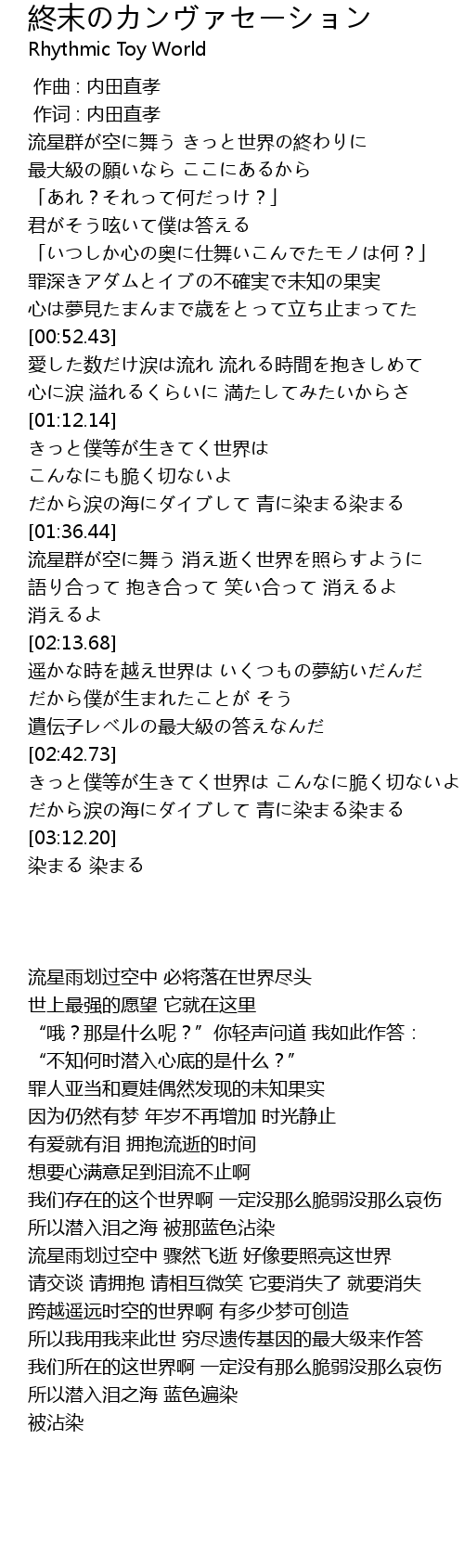 | [00:00.00] | 流星群が空に舞う きっと世界の終わりに |