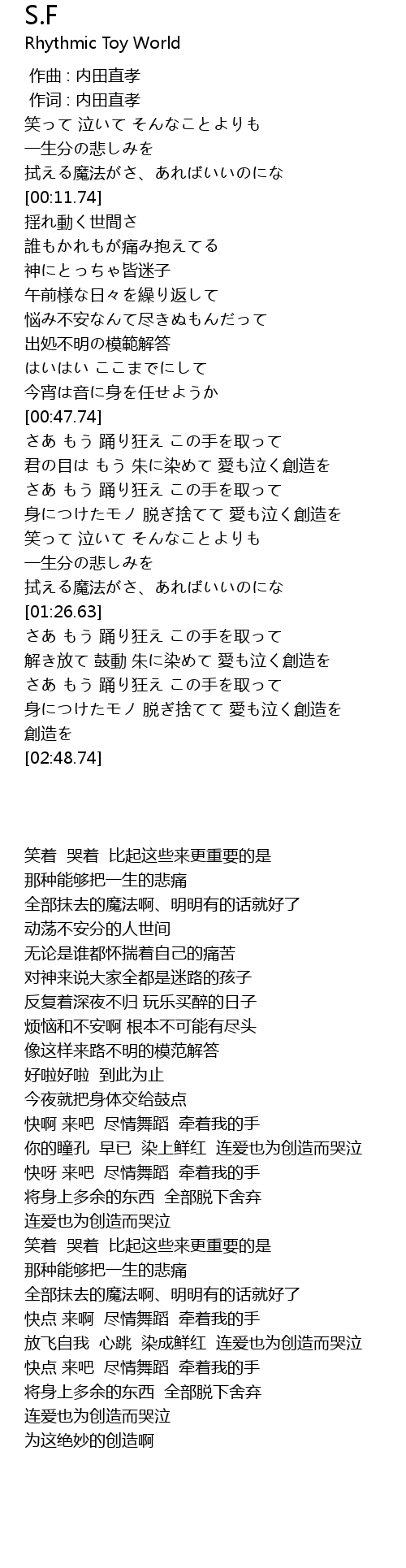 | [02:22.68] | 身につけたモノ 脱ぎ捨てて 愛も泣く創造を |