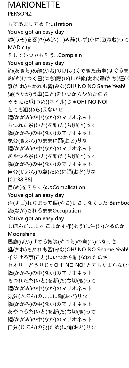 | [01:24.66] | 鏡(かがみ)の中(なか)のマリオネット 自分(じぶん)の為(ため)に踊(おど)りな |