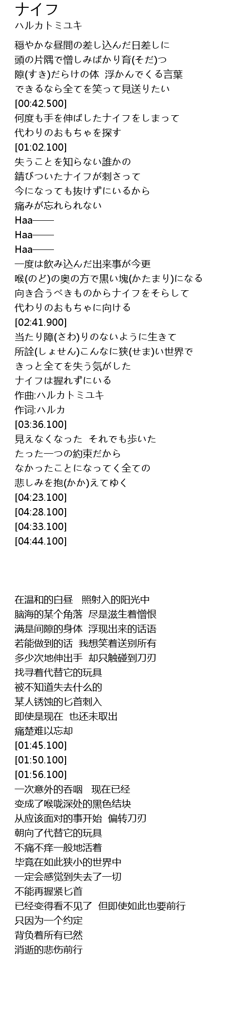 | [00:43.100] | 何度も手を伸ばしたナイフをしまって |