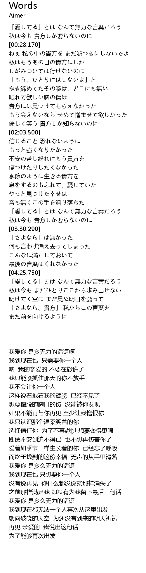 | [04:26.490] | 「愛してる」とは なんて無力な言葉だろう |
