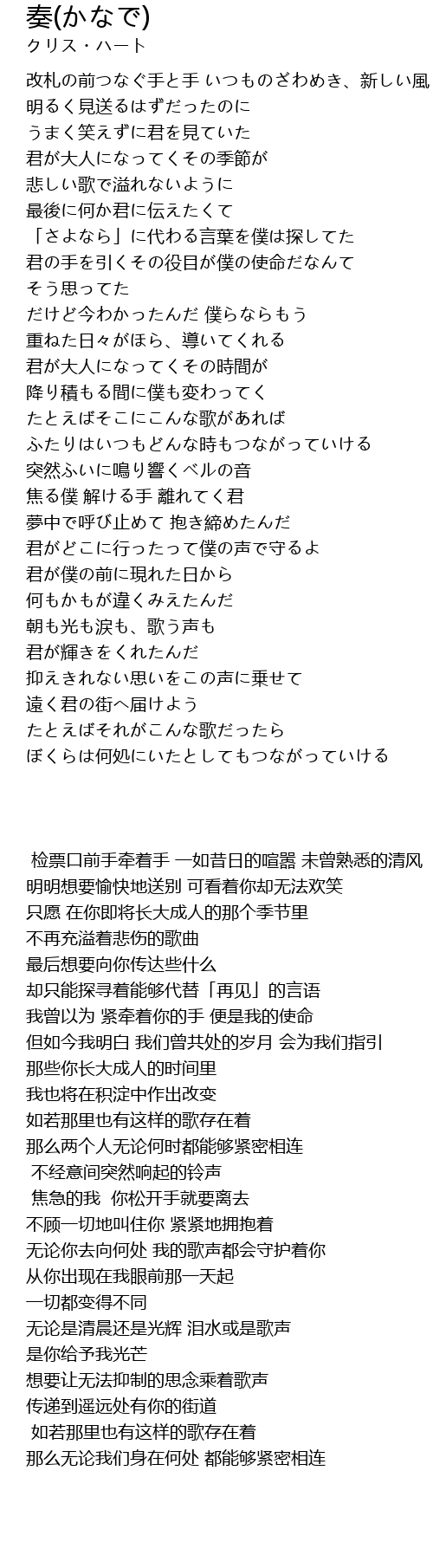 | [00:19.56] | 改札の前つなぐ手と手 いつものざわめき、新しい風 |