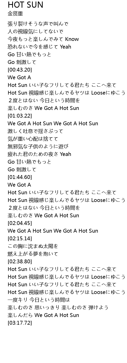 | [00:44.64] | Hot Sun いい子なフリしてる君たち ここへ来て |
