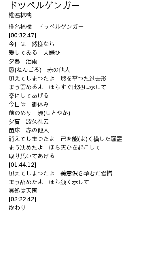 | [00:00.00] | 椎名林檎 - ドッペルゲンガー |