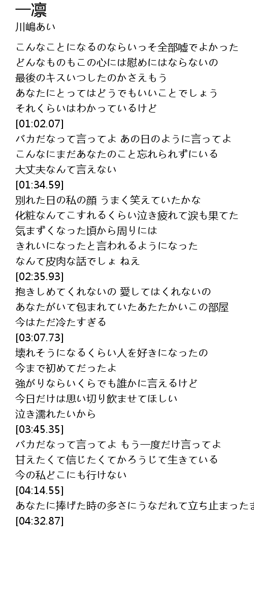 | [00:14.25] | こんなことになるのならいっそ全部嘘でよかった |