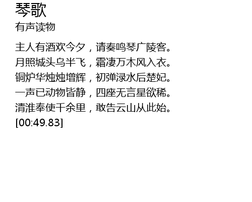 | [00:05.13] | 主人有酒欢今夕,请奏鸣琴广陵客。 |
