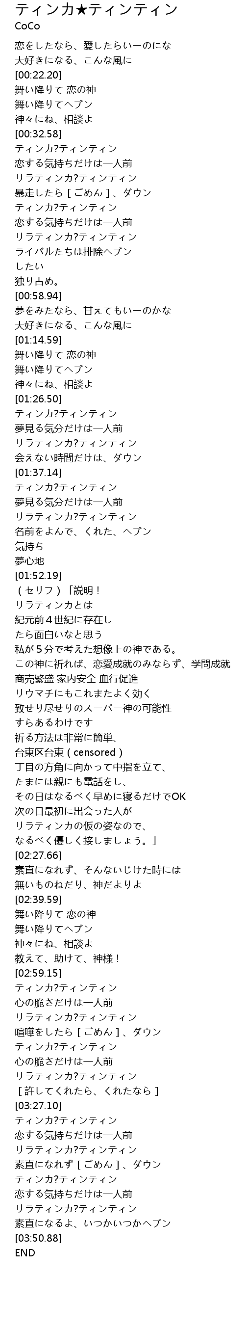 | [03:20.44] | リラティンカ?ティンティン |