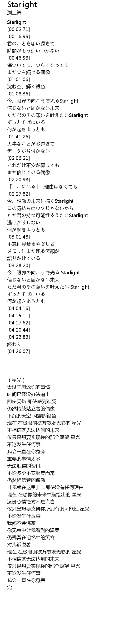 | [03:30.41] | 今、限界の向こうで光る Starlight |