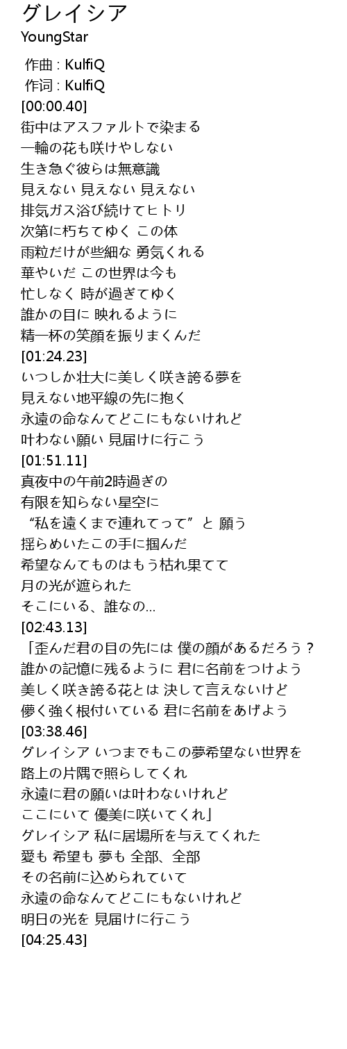 | [03:41.91] | グレイシア いつまでもこの夢希望ない世界を |