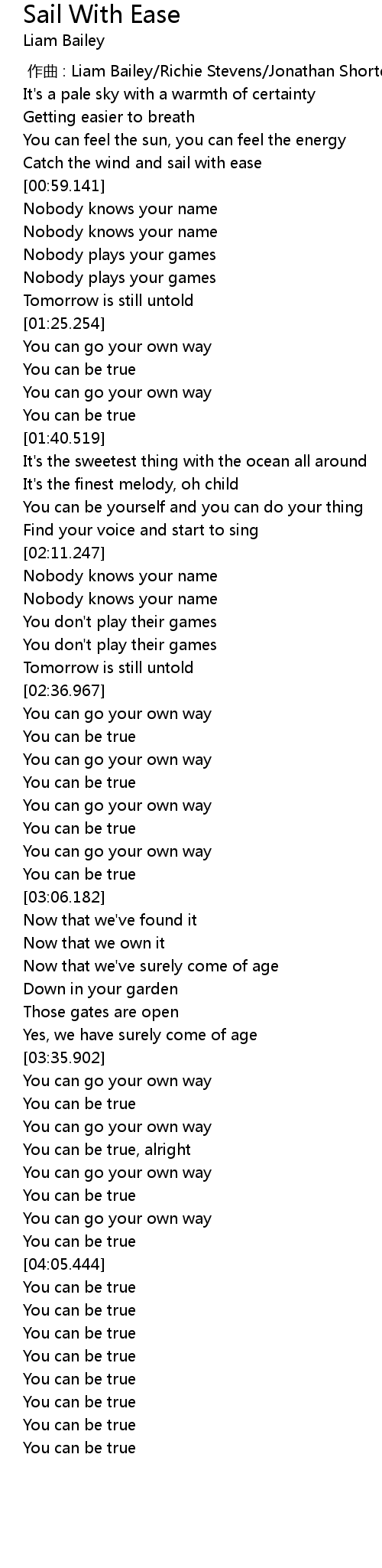 | [00:00.000] | zuo qu : Liam Bailey Richie Stevens Jonathan Shorten Naville Malcome |