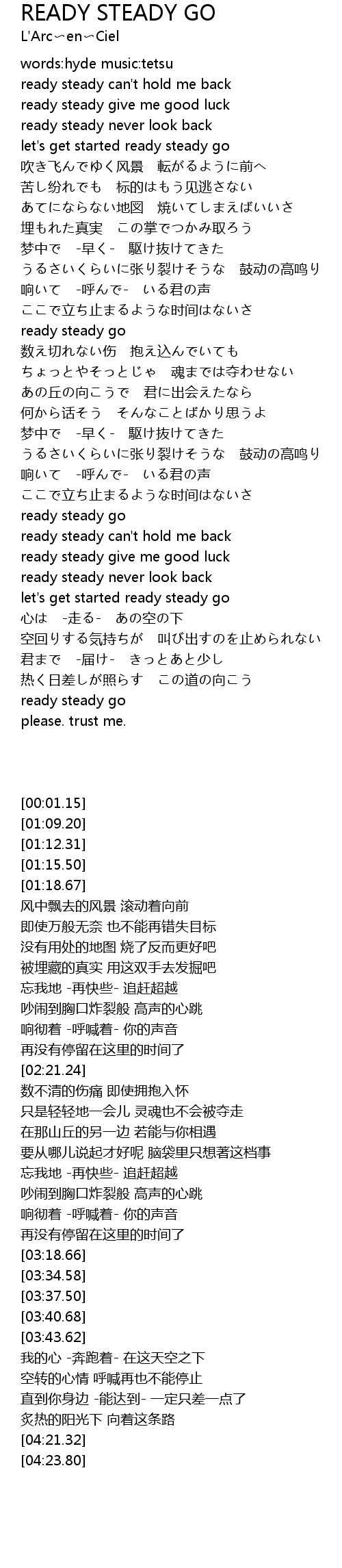 | [01:15.50] | ready steady never look back |