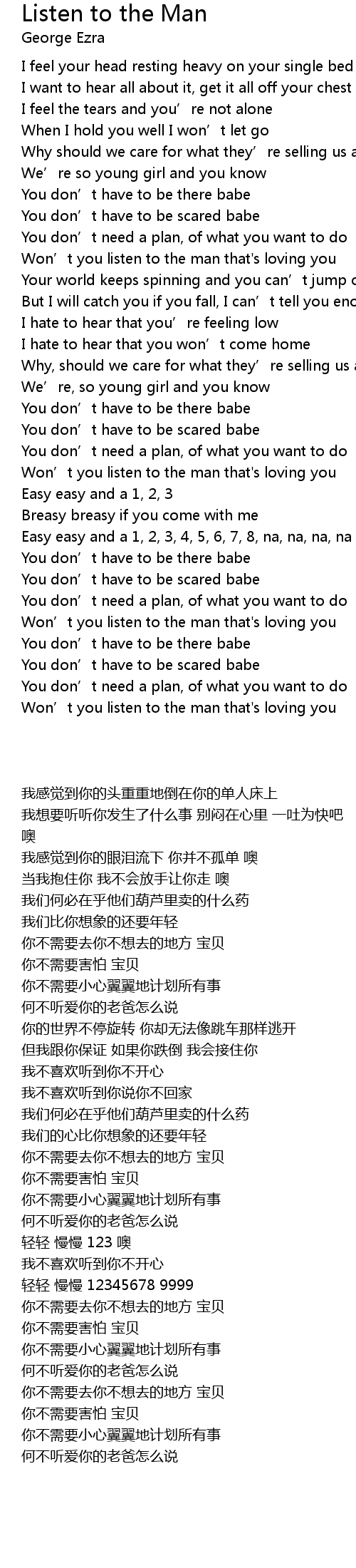 | [00:51.72] | Won' t you listen to the man that' s loving you |