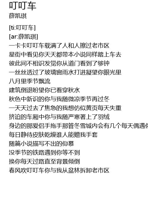 | [00:24.295] | yī kǎ kǎ dīng dīng chē zài mǎn le rén hé rén cā guò lǎo shì qū |