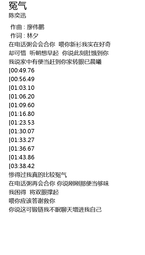 | [03:11.62][01:23.53] | 昵称方可亲昵死你 惨得过欢喜这冤气 |