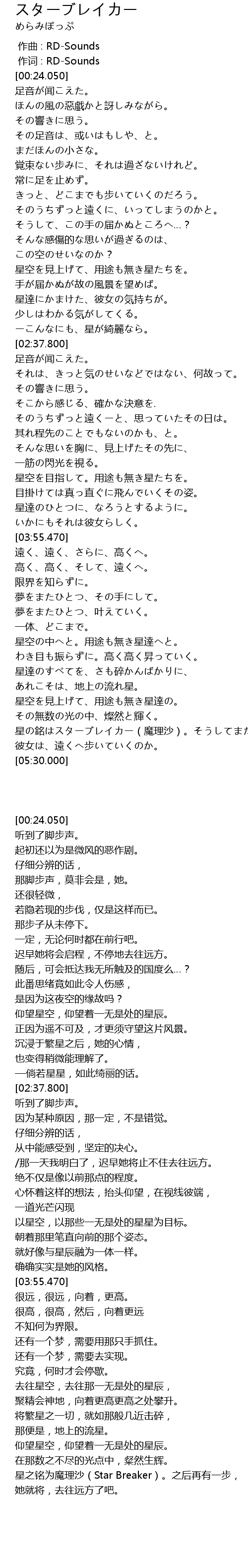 | [03:29.390] | 星空を目指して。用途も無き星たちを。 |