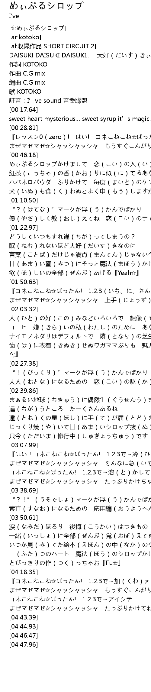 | [04:37.23] | まぜマゼマゼ☆シャッシャッシャ たっぷりかけてね めぃぷるシロップ わぁい』 |