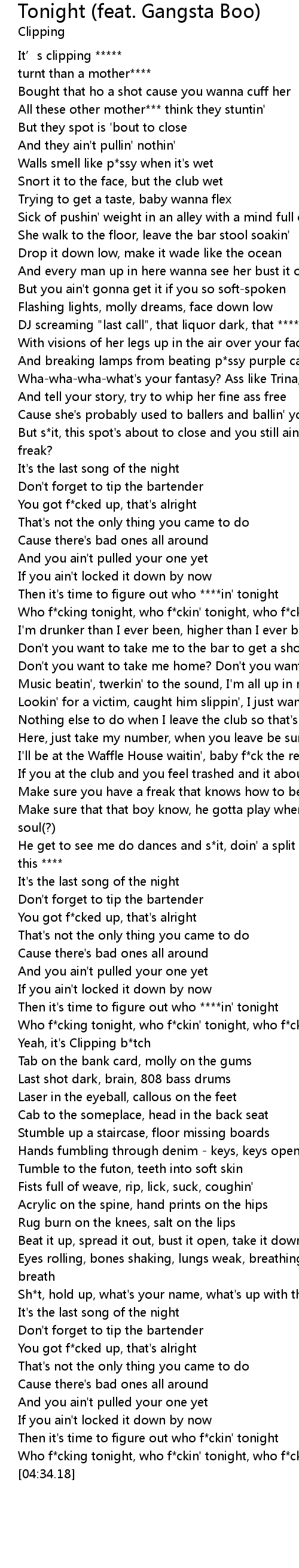 | [04:34.18] | Who f*cking tonight, who f*ckin' tonight, who f*ckin' tonight |