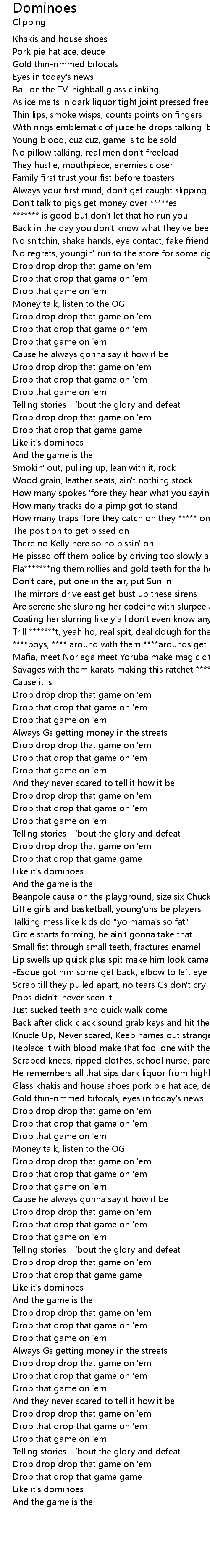 | [01:13.28] | No snitchin, shake hands, eye contact, fake friends, ain't *******t |