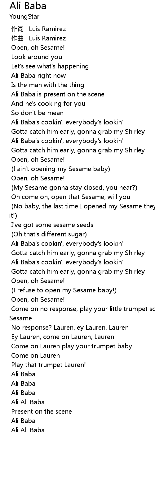 | [02:17.377] | Ali Baba' s cookin', everybody' s lookin' |