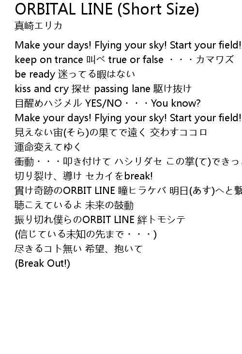 | 貫け奇跡のORBIT LINE 瞳ヒラケバ 明日(あす)へと繋がってゆく | |
