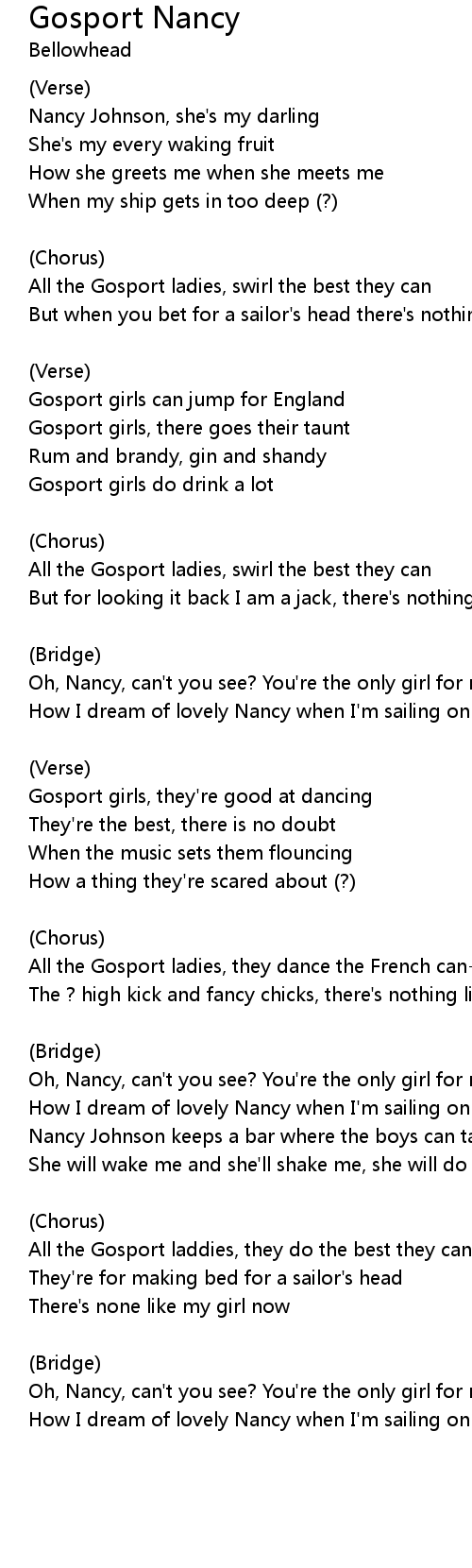 How I dream of lovely Nancy when I'm sailing on the sea |