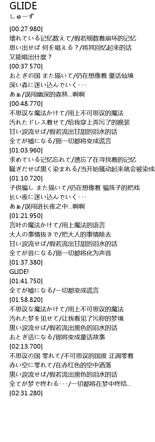 | [02:13.990] | 不思议の国 零れて/不可思议的国度 正凋零着 |