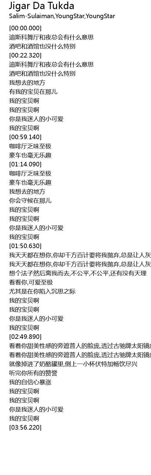 | [03:19.720] | 看着你甜美性感的旁遮普人的脸庞,透过古驰牌太阳镜向你传达情意,感觉美妙无比 |
