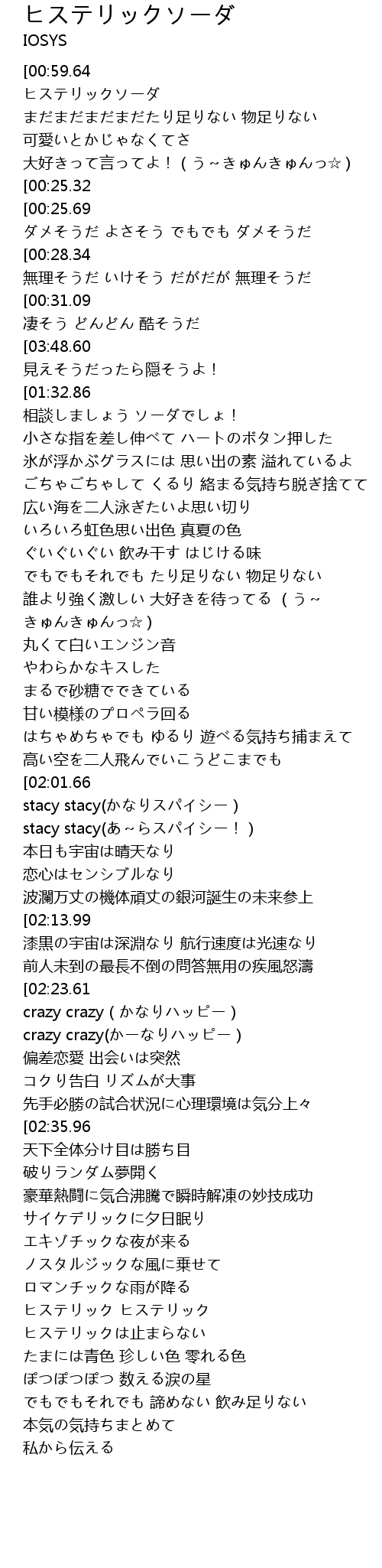 | [00:01.31][00:59.64][01:05.42][01:10.89][03:15.80][03:21.25][03:26.66] | ヒステリック ヒステリックソーダ |