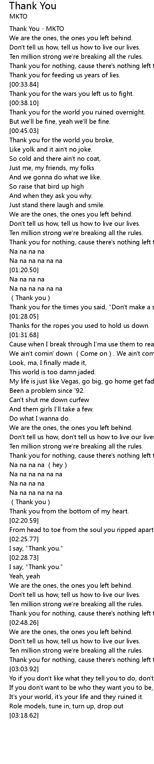 | [01:28.99] | Thanks for the ropes you used to hold us down. |