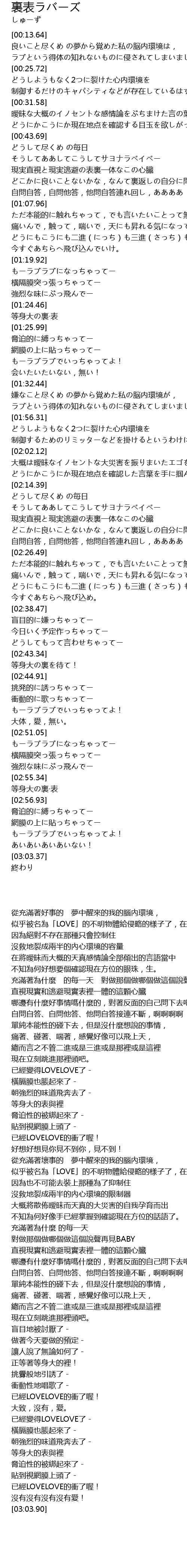 | [01:53.26] | 似乎被名為「LOVE」的不明物體給侵略的樣子了,在那之後。 |