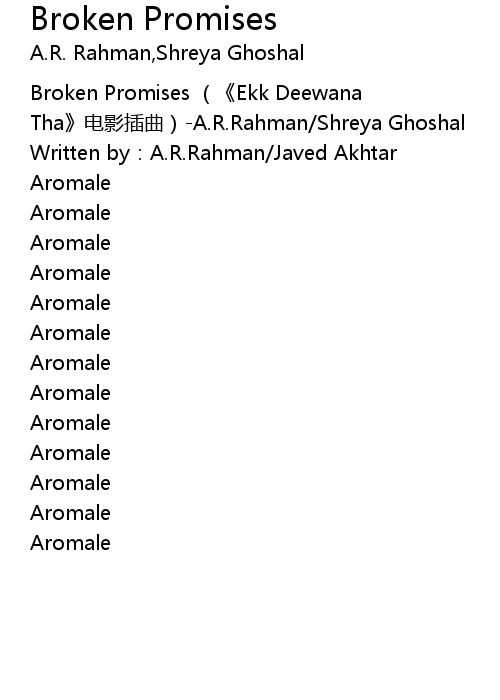 | [00:00.214] | Broken Promises Ekk Deewana Tha diàn yǐng chā qǔ A. R. Rahman Shreya Ghoshal |