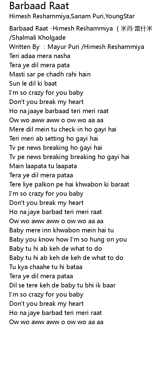 | [00:00.00] | Barbaad Raat Himesh Reshammiya mi xiao lei shen mi ya Sanam Puri Shalmali Kholgade |