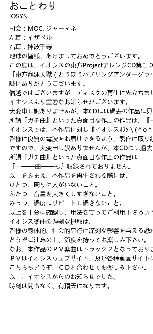 | [00:16.38] | この度は、イオシスの東方ProjectアレンジCD第10弾 |
