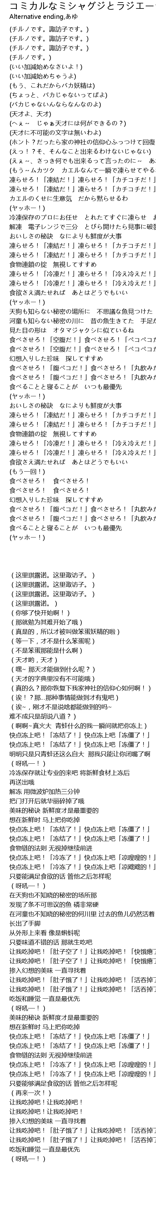 | [00:43.51] | 快点冻上吧!「冻结了!」快点冻上吧「冻僵了!」 |