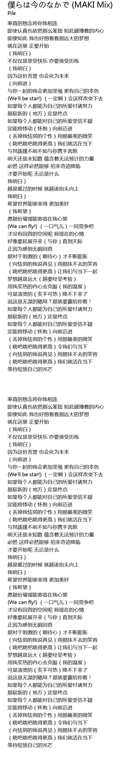 | [02:14.68] | We can fly! yī kǒu qì r yī tóng jìng zhēng ba |