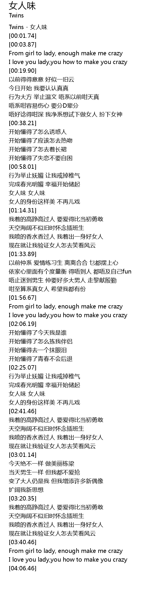 | [01:57.32] | From girl to lady, enough make me crazy |