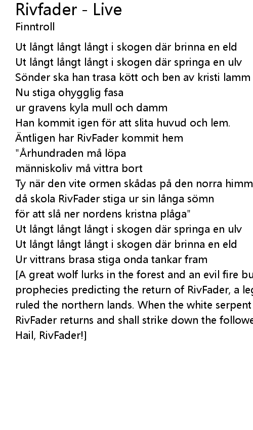 | [A great wolf lurks in the forest and an evil fire burns between the trees. Two prophecies predicting the return of RivFader, a legendary troll-king who once ruled the northern lands. When the white serpent is seen on the arctic sky RivFader returns and shall strike down the followers of the christian plague. Hail, RivFader!] |