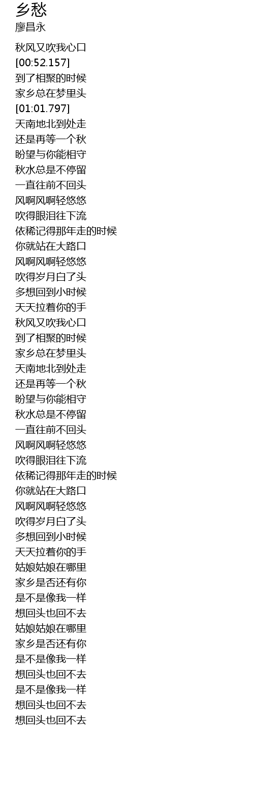 | [00:55.980] | jiā xiāng zǒng zài mèng lǐ tou |