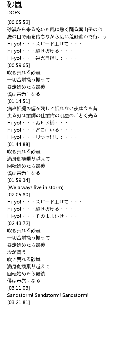 | [02:44.42] | 吹き荒れる砂嵐 |