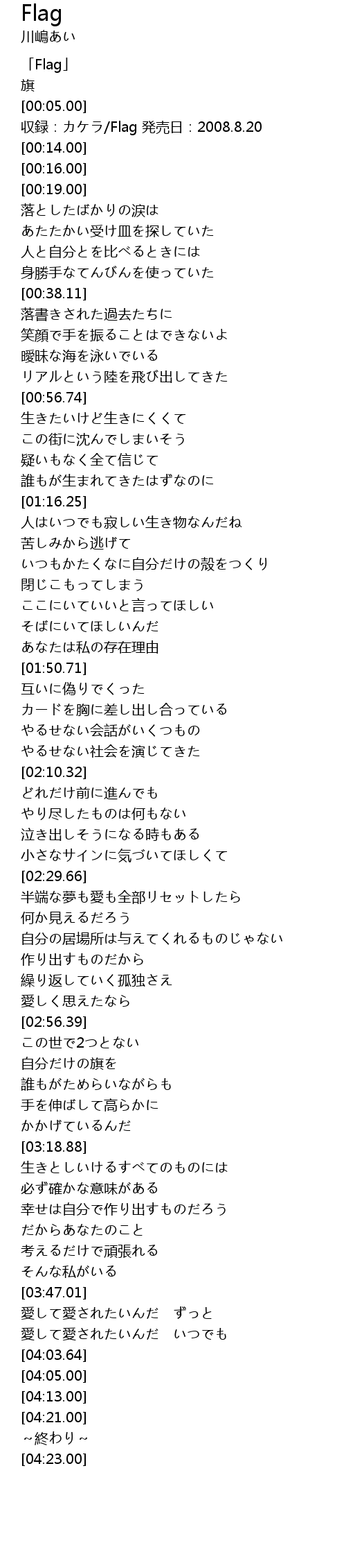 | [00:10.00] | 収録:カケラ/Flag 発売日:2008.8.20 |