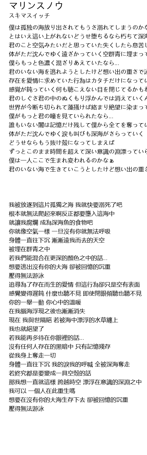 | [03:46.156] | 身體一直往下沉 我的淚我的呼喊 全被深海奪走 |