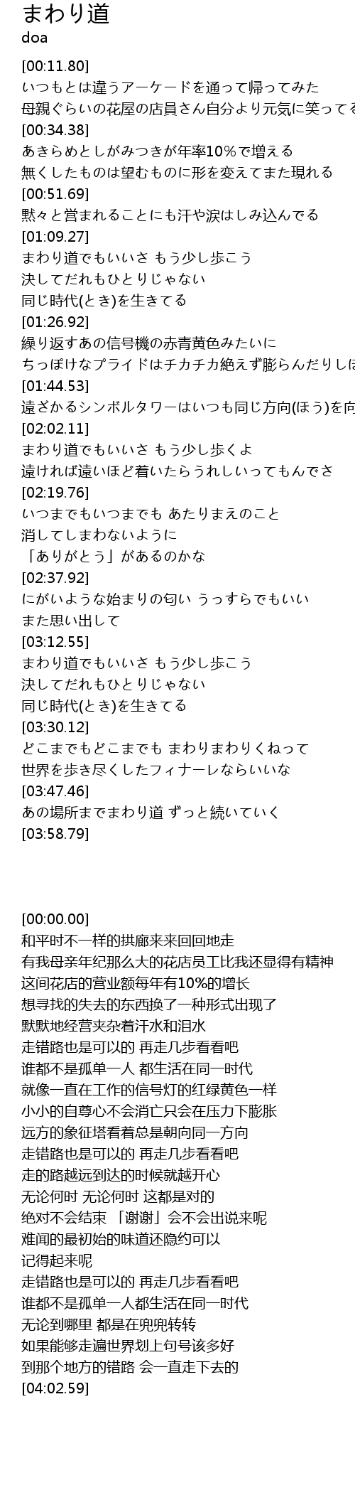 | [03:48.46] | あの場所までまわり道 ずっと続いていく |