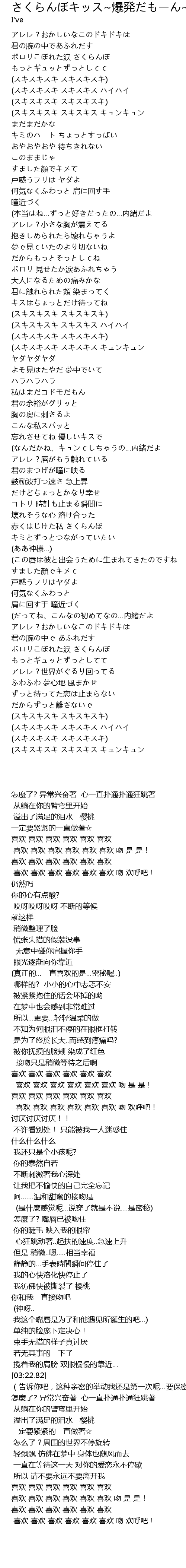 | [03:22.82] | (告诉你吧,这种亲密的举动我还是第一次呢…要保密哟…) |
