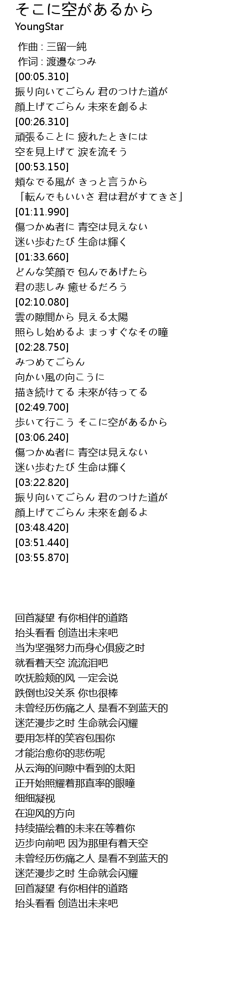 | [02:54.910] | 歩いて行こう そこに空があるから |