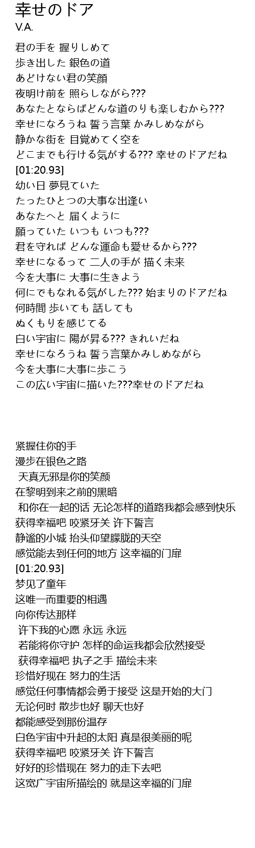 | [01:17.72] | どこまでも行ける気がする??? 幸せのドアだね |