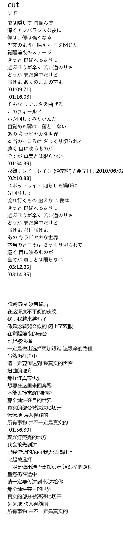 | [01:56.39] | 収録:シド - レイン (通常盤)/発売日:2010/06/02 |
