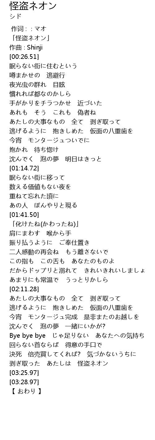 | [03:21.44] | 剥ぎ取った あたしは 怪盗ネオン |